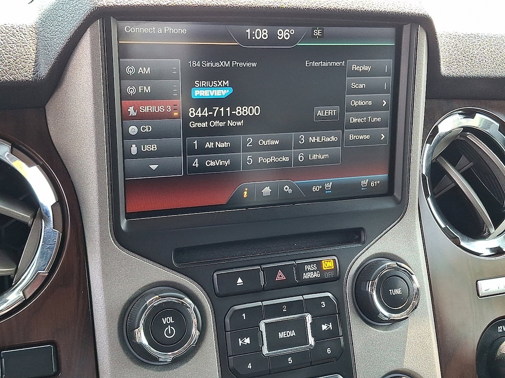 ENGINE: 6.7L POWER STROKE V8 TURBO DIESEL B20 4 valve OHV, manual push-button engine-exhaust braking, 26 Gallon Fuel Tank, GVWR: 11,200 lb Payload Package, 3.31 Axle Ratio, Dual 78-AH 750 CCA Batteries, CHROME PACKAGE Wheels: 18 Chrome Clad Cast Aluminum, chrome-clad hub covers/center ornaments, Chrome Exhaust Tip, Unique Chrome Mirror Caps, 6 Angular Chrome Step Bars, VOICE-ACTIVATED NAVIGATION HD and satellite broadcast, LARIAT INTERIOR PACKAGE Memory Power Heated/Cooled Drivers Seat, easy-entry/exit memory drivers seat feature, Memory Power Adjustable Pedals, Remote Start System, Power Heated/Cooled Passenger Seat, Memory PowerScope Trailer Tow Mirrors, TOUGH BED SPRAY-IN BEDLINER tailgate-guard, black box bed tie-down hooks and black bed attachment bolts, ELECTRONIC LOCKING W/3.55 AXLE RATIO, TAILGATE STEP & HANDLE, TRANSMISSION: TORQSHIFT 6-SPEED AUTOMATIC (6.7L) SelectShift. Ford Lariat with White Platinum Metallic Tri-Coat exterior and Black interior features a 8 Cylinder Engine with 440 HP at 2800 RPM*. Serviced here, Managers special!