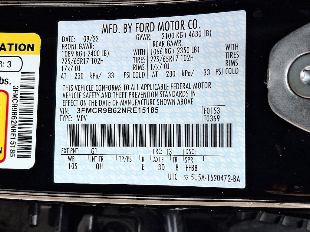 Front Driver & Passenger Seatback Zipper Pockets, Leather-Wrapped Steering Wheel, Rear Parking Sensors, Wireless Charging Pad, Heated Front Bucket Seats, 8-way power drivers seat (fore/aft, up/down, recline, lumbar), LED Fog Lamps, Universal Garage Door Opener (UGDO), Intelligent Access (Lock/Unlock), push-button start and SecuriCode keyless-entry keypad, auto start-stop technology (STD). Ford Big Bend with Shadow Black exterior and Ebony interior features a 3 Cylinder Engine with 181 HP at 6000 RPM*. Clean CARFAX report! Local owner. One owner vehicle